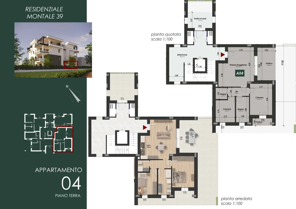 Rif. CAP394/4 - MONTALE (Conad): NOSTRA ESCLUSIVA Appartamento n. 04 di 115 mq comm. li posto al piano terrra con ingresso indipendente e giardino privato di mq 177, ingresso su soggiorno pranzo, angolo cottura, due camere, disimpegno e due bagni. Garage e posto auto compreso nel prezzo di acquisto. CLASSE A4 NZEB, capitolato di pregio, finiture personalizzabili. Consegna fine 2026. euro 380000.