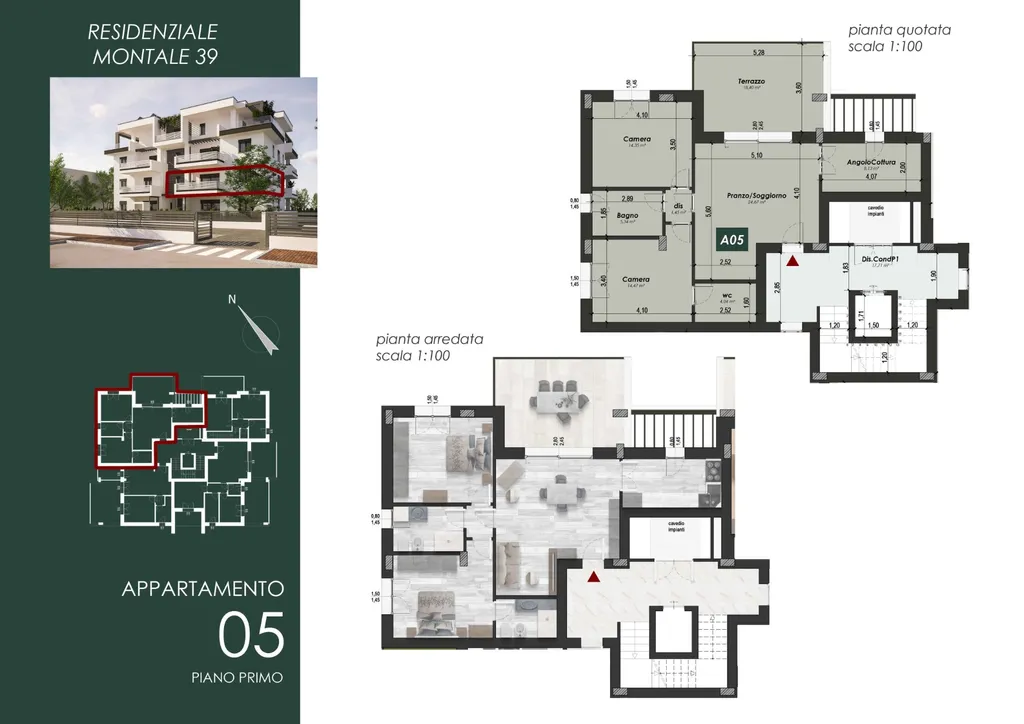 Rif. CAP394/5 - MONTALE (Conad): NOSTRA ESCLUSIVA Appartamento n. 05 di 114 mq comm. li posto al piano primo con ascensore, ingresso su soggiorno pranzo, angolo cottura, due camere, disimpegno e due bagni. Ampia terrazza. Garage e posto auto compreso nel prezzo di acquisto. CLASSE A4 NZEB, capitolato di pregio, finiture personalizzabili. Consegna fine 2026. euro 375000.